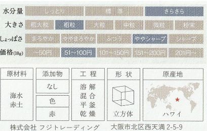 ハワイの島々を取り囲む海の底には、火山の噴火でできた赤土の土壌が拡がっています。この土を長時間いり、ハワイの海水と一緒に煮詰めて作られた塩です。大地の鉄分がぎゅっと閉じ込められていて、口に含むと、程よく辛口なしょっぱさと、ほのかな土の香りが感じられます。ハワイの島々では神様への捧げものとして、儀式やお清めなどにも使用されています。海水塩としては珍しい赤い塩です。